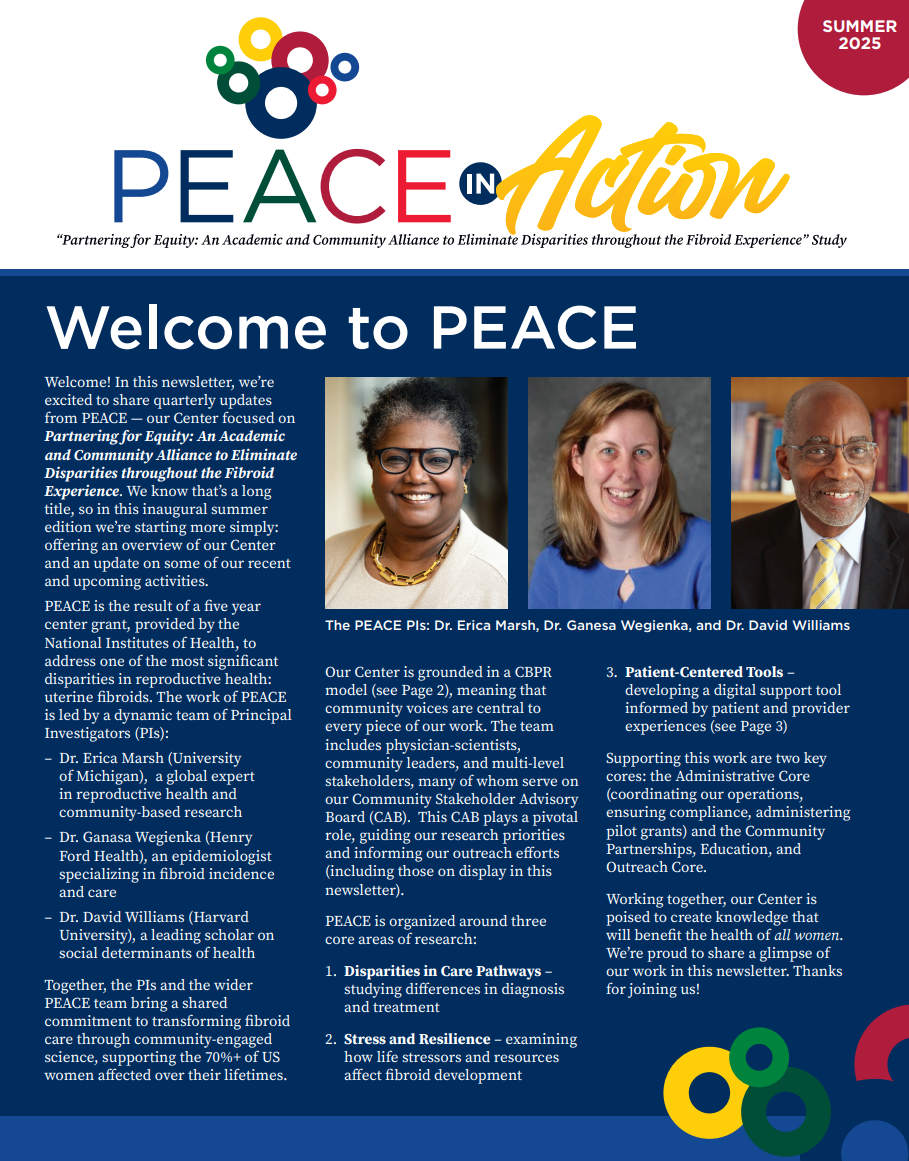 To confront these challenging issues, the work of PEACE is led by a dynamic team of Principal Investigators (PIs): Dr. Erica Marsh (University of Michigan), a global expert in reproductive health and community-based research; Dr. Ganasa Wegienka (Henry Ford Health), an epidemiologist specializing in fibroid incidence and care; and Dr. David Williams (Harvard University), a leading scholar on social determinants of health